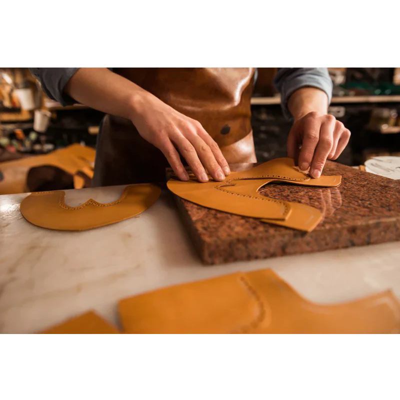 Cutting: The leather is cut into the various pieces needed to make the shoe. This is typically done by hand, using a sharp knife or scissors.